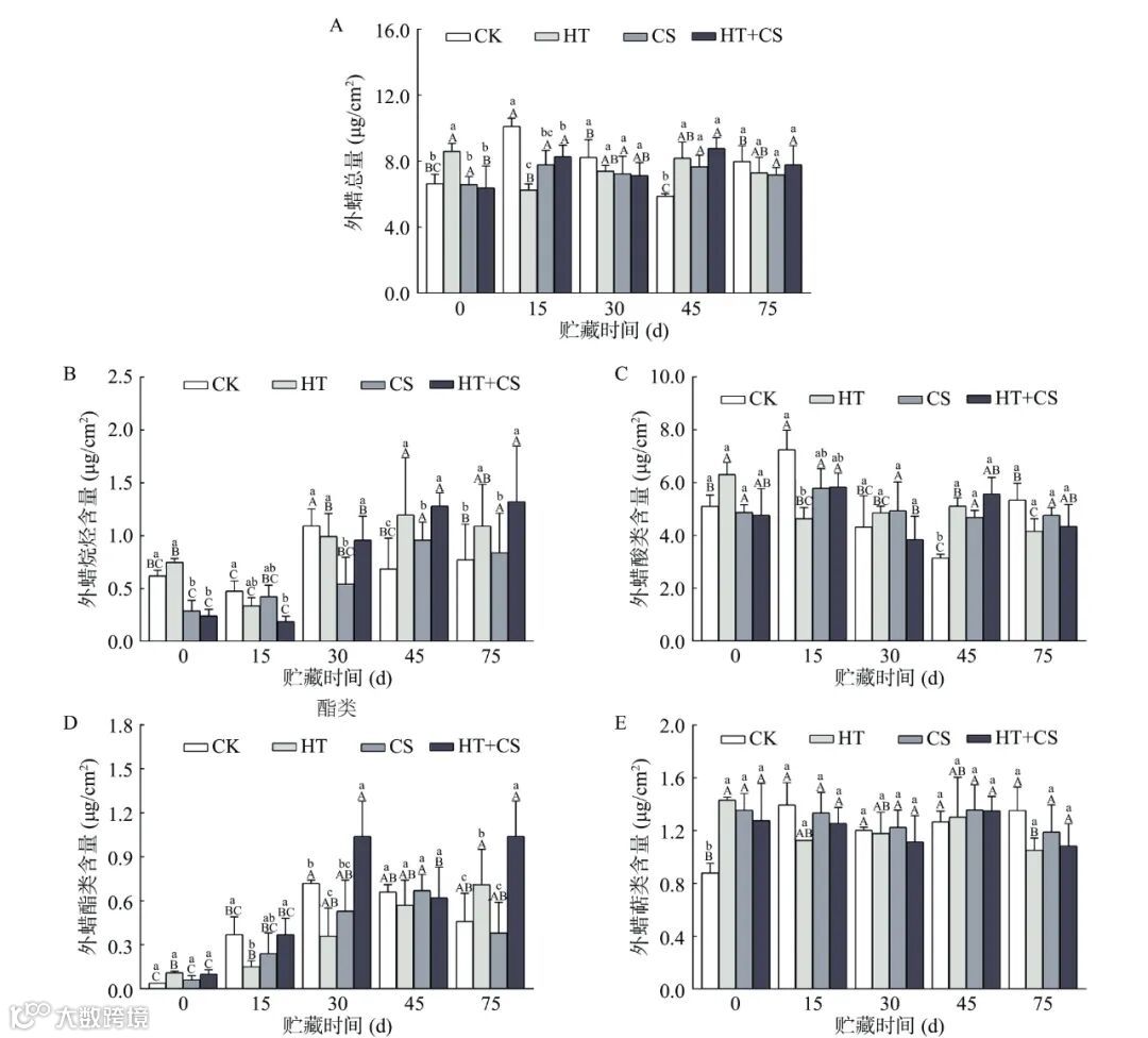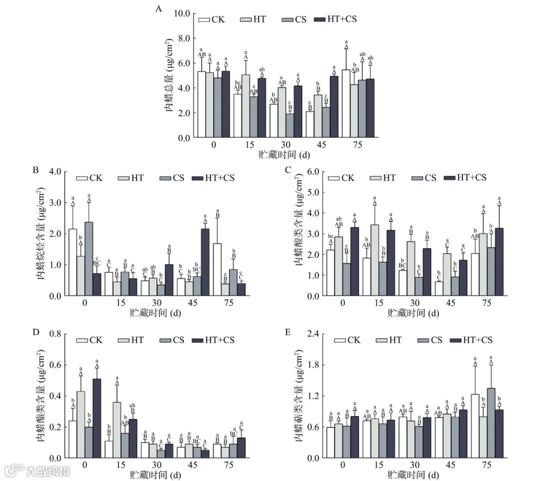 注:图例中字母表示不同处理组,数字表示不同冷藏天数;-E结尾为外蜡组分;-I为内蜡组分;-C为角质组分。