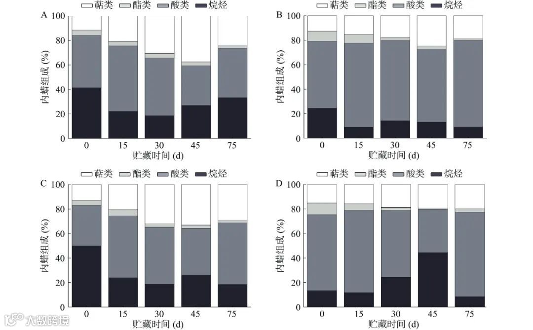 Figure 3. Proportion of epicuticular wax components of 'Nanfeng' mandarins from different treatments during cold storage