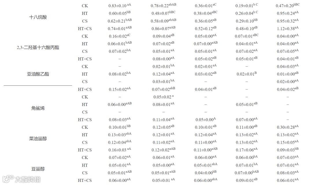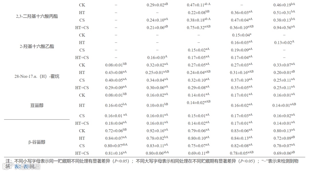 ‘南丰蜜桔’去除外蜡后制得内蜡,不同处理对表皮内蜡主要化学组成及含量的影响如表2所示。表皮内蜡同样检出烷烃、酸类、酯类及萜类4类主要化学成分,包括19种烷烃、16种酸、8种酯、5种萜、2种醇共50种成分,比外蜡要多12种。其中,所有处理组不同冷藏期果实都能检出12种内蜡组分,含量最多的内蜡成分仍然是十六烷酸。特别注意的是,与果实外蜡萜类成分相比,内蜡还检出了角鲨烯、菜油甾醇和β-香树精3种萜类物质,可能是由于三萜类物质呈环状二维结构多填充于聚酯结构的角质中,因此在内蜡中相对较多而外蜡中相对较少。前人在探究‘温州蜜柑’和‘冰糖橙’贮藏中的角质层组分差异时,发现内蜡能显著抑制指状青霉菌的菌丝生长和孢子萌发,其中萜类物质起到关键作用。角鲨烯也被证明可参与清除自由基和提高氧负荷。本研究发现角鲨烯成分仅在CK组第15 d和HT组第0、15、45 d检测到,推测HT处理能更好地保持果实品质。
