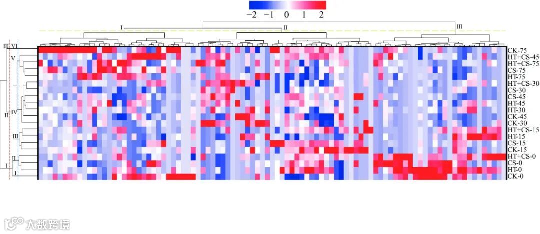 采用Ward最小方差和欧式距离法对检出的角质层组分数据进行聚类分析,结果以热图形式显示在图8。图例表示红色越深值越大,物质含量就越高;而蓝色越深值越低,含量则越低。左边是样品的聚集区,上边是角质层成分的聚集区。左边分支和上边分支轴欧式距离越长,相关性就越弱。如红线所示样本可以大致分为三大类,为0 d、15~75 d以及CK组第75 d三个贮藏阶段。进一步细分为6类,同一类的样本之间存在较强的相关性。0 d样本进一步分为CK组和其他处理组,表明果实经不同处理后,在冷藏开始时就已经有了成分代谢的响应变化。分类Ⅲ都是15 d样品。而30 d和45 d的样本被归为Ⅳ类,说明该时期各处理之间差异较小,热图也由大面积红色转为临界色,含量明显下降。值得注意的是,HT+CS组第45 d和其他组75 d样本被分到了Ⅴ类,该类样本含量显著升高,说明HT+CS组后期合成角质层成分较其他组更快。而CK组的第75 d样品红色区域较多较深单独归为一类,和前期分析一致,可能是由于冷藏后期CK组以抵御微生物侵染而提前合成更多的角质层成分。表皮外蜡、内蜡和角质单体的聚集可分为3类。几乎所有的第一类物质都是内蜡组分,第二类物质也几乎是外蜡组分,第三类则几乎包括内蜡和绝大多数的角质单体组分,表明外蜡、内蜡以及角质成分之间存在聚类差异。随着冷藏时间的延长,Ⅰ类物质含量总体上呈现先下降后上升的趋势,与图4内蜡总量变化一致;II类物质颜色差异较小,冷藏前后含量变化不明显,也与图2外蜡总量无明显变化规律相吻合;最后一类物质贮藏前后期颜色变化显著,整体上物质含量随着贮藏时间延长而降低。