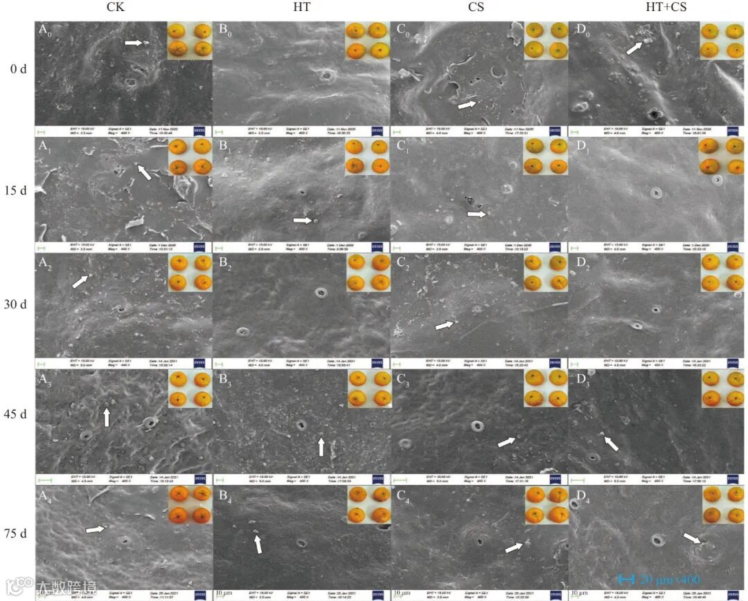 ‘南丰蜜桔’经不同处理后,各处理的果实表皮外蜡形态结构已发生变化,用浅蓝色箭头在图1中标出了外蜡晶体的位置。0 d时,CK组果皮外蜡层分布了大量的蜡质晶体,为不规则血小板状,与报道的柑桔表皮蜡质晶体形状一致,还能观察到皮孔的存在;CS组和HT+CS组表面被壳聚糖膜覆盖,可见明显的蜡质晶体轮廓;HT组蜡质层较为光滑平整,无明显的外蜡晶体分布。随着冷藏时间的延长,表皮外蜡在不同处理中呈现不同的变化趋势(图1)。冷藏0~45 d时,CK组的果皮外蜡晶体数量呈先减后增的趋势,且出现明显裂纹;CS组和HT+CS组果皮外蜡晶体数量持续减少,逐渐趋于光滑平整。直到75 d时,观察到4个处理的果皮表面均无明显外蜡晶体。从不同处理间的差异分析,同时期CK组的外蜡晶体数量比其他组更多,表面也更为粗糙。前人研究表明热激能使果实外蜡晶体结构特征消失,本研究发现HT组果实表皮在冷藏期间基本保持光滑平整状态,推测52 ℃的热激处理导致表皮外蜡熔融重分布形成更光滑的表皮外观。涂膜处理的CS组和HT+CS组,冷藏开始后表皮蜡层完好无损,均被致密完整的聚合膜覆盖。Xu等也发现壳聚糖涂膜处理对果实表皮外蜡可起到有效的防护。所有处理在贮藏结束时均形成了较完整的表皮表面。表皮蜡质作为‘南丰蜜桔’最外层的保护屏障,较完整的蜡质层和较少的裂缝助于阻止水分散失并有效地抵御外界微生物侵染,进而维持果实品质。