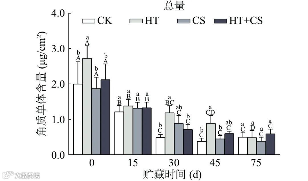 图 6 不同处理对‘南丰蜜桔’冷藏过程中表皮角质单体总量的影响