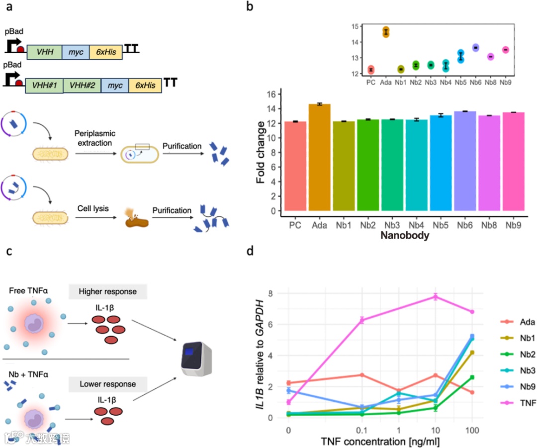 实验结果显示,该系统分泌的纳米抗体具有与常用药物相当的TNF-α结合能力,并在细胞实验中表现出显著的抗炎效果。