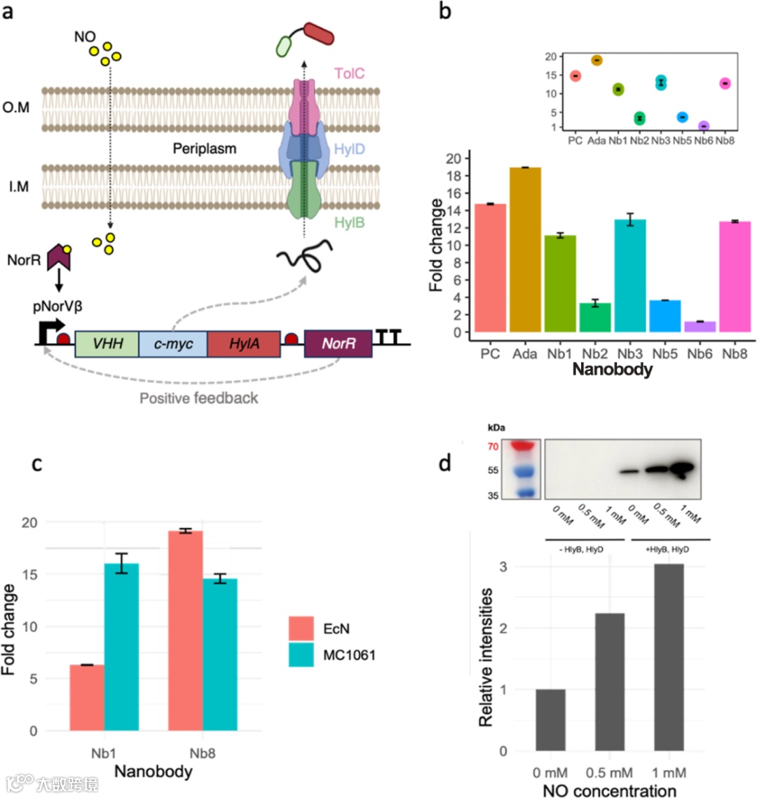 首先,该研究团队成功构建了包含NO检测模块、分泌系统和人源化纳米抗体的工程化EcN系统,该系统能够响应肠道炎症标志物NO,分泌出具有治疗潜力的纳米抗体。