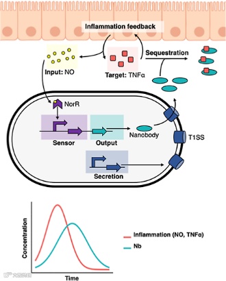 该系统由三部分组成:基于转录因子NorR的炎症标志物一氧化氮(NO)检测模块、I型溶血素分泌系统,以及包含人源化抗TNF-α纳米抗体的治疗性负载。实验结果显示,该系统在检测到NO后能够浓度依赖性地响应,并成功分泌出功能性的纳米抗体,这些抗体在结合TNF-α的能力上与常用药物Adalimumab相当。
