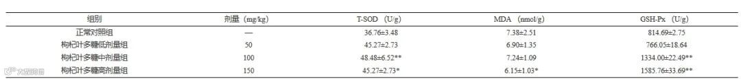 表 1 枸杞叶多糖干预对小鼠血清抗氧化能力的影响(x¯ ±s,n=10)