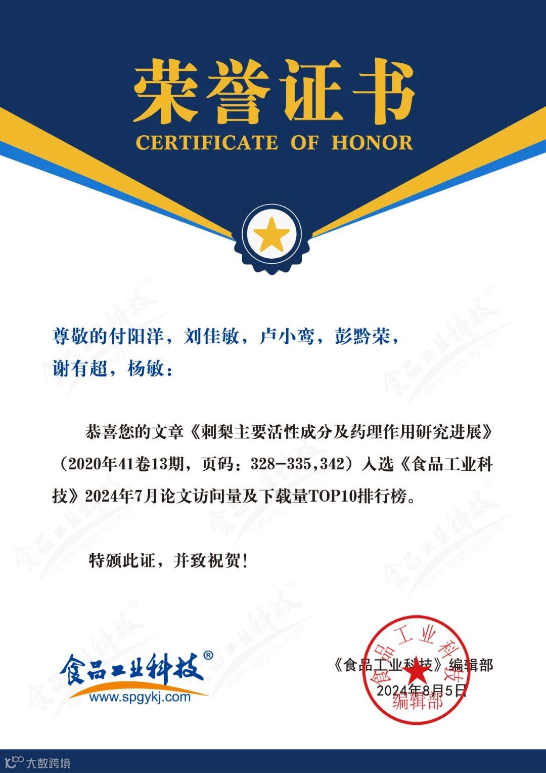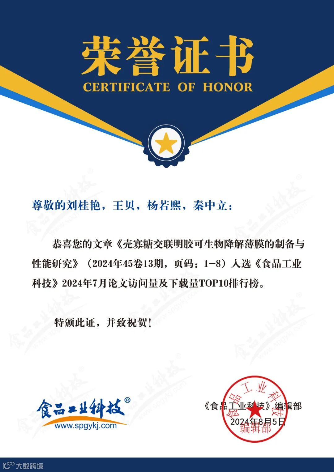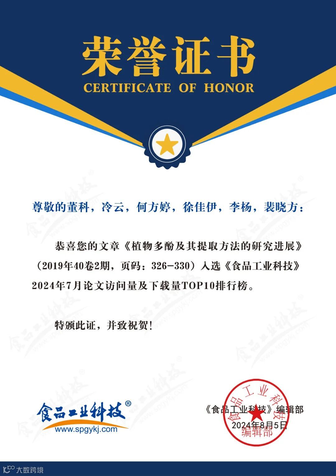 2024年6月起,《食品工业科技》编辑部每月将会公布上个月的文章下载量排行榜。《食品工业科技》将坚守办刊宗旨,秉承严谨细致、精益求精的工作态度,肩负时代赋予的社会责任,稳中求进、奋楫争先,为推动我国食品领域的发展做出更多贡献。