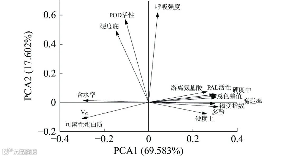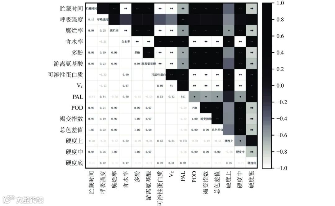 对各个生理指标数据进行相关性分析,如图7所示。贮藏时间与腐烂率、多酚含量、游离氨基酸、POD活性、褐变指数、总色差值、中部硬度呈现极其显著正相关(P<0.01),与含水率、可溶性蛋白质、VC含量、PAL活性、底部硬度呈现极其显著负相关(P<0.01),说明贮藏期间腐烂率、多酚含量、游离氨基酸、POD活性、含水率、可溶性蛋白质、VC含量、PAL活性、底部硬度的变化均能影响方竹鲜笋的保鲜效果,且呼吸强度和PAL活性呈现极其显著正相关(P<0.01),因此方竹笋贮藏期间的各个生理指标中有着很大的关联。