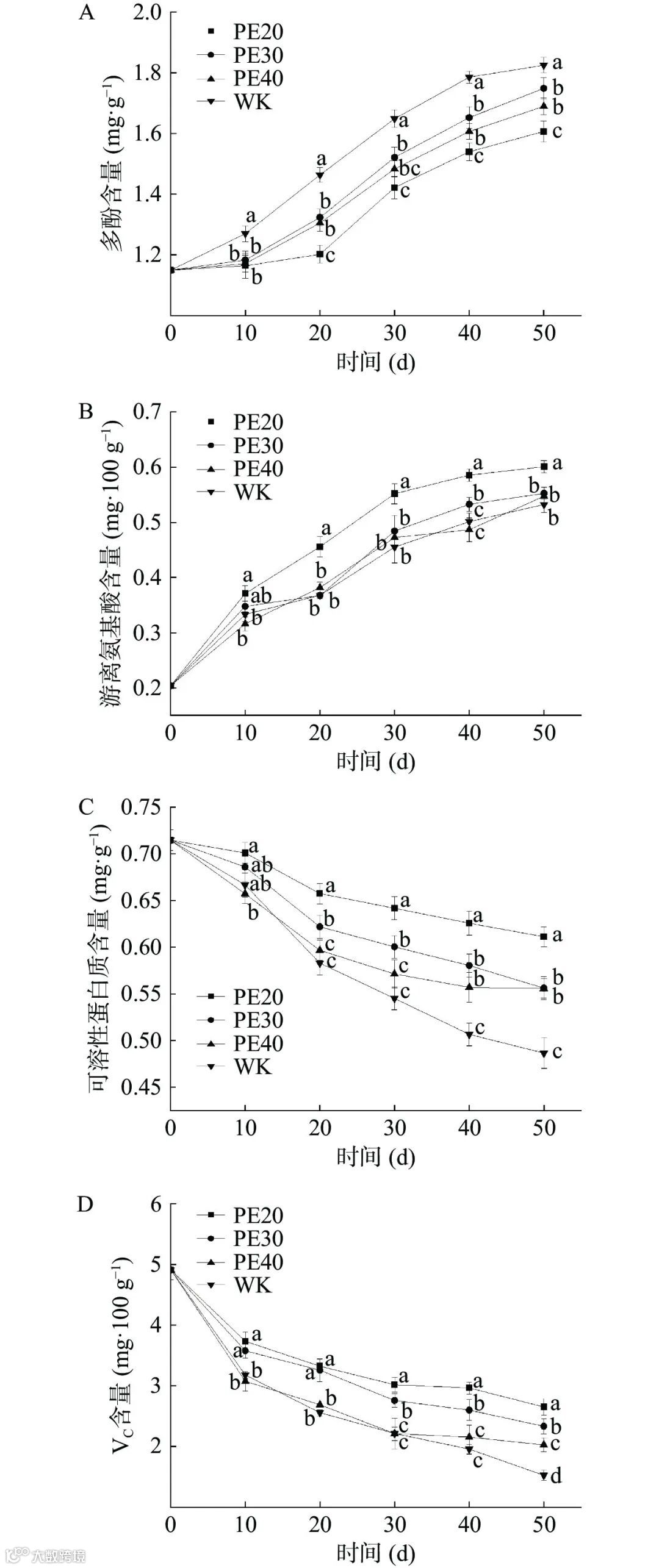 图 5 自发气调包装处理对方竹鲜笋多酚、游离氨基酸、可溶性蛋白质、VC含量的影响