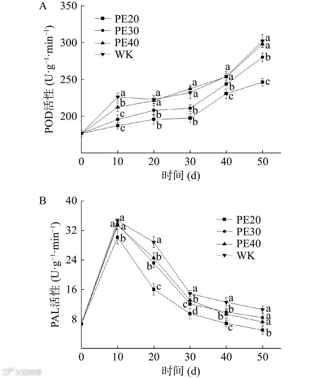 图 6 自发气调包装处理对方竹鲜笋POD活性和PAL活性大小的影响