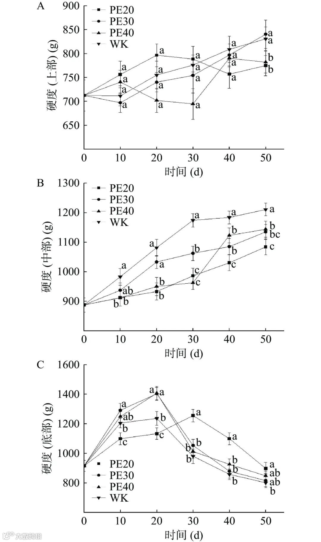 Figure 3. Effect of spontaneous modified atmosphere packaging on the hardness of fresh bamboo shoots