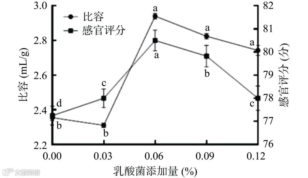2.4 乳酸菌粉添加量对多谷物杂粮面包比容和感官品质的影响