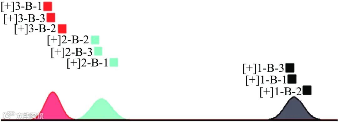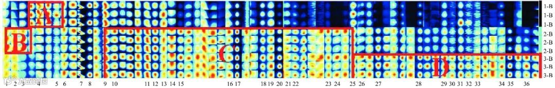 注:1-B:小麦粉面包;2-B:单一酵母菌发酵多谷物杂粮面包;3-B:酵母菌与0.06%复合乳酸菌粉发酵多谷物杂粮面包;图7同。1:3-甲基丁醛;2:2-甲基丁醛;3:戊醛二聚体;4:异戊醇;5:2-壬酮;6:2-戊酮;7:乙醇;8:乙酸乙酯;9:异丁醇;10:异丁醇聚合物;11:2,3-丁二酮;12:2-丁酮;13:正己醇;14:正己醇二聚体;15:正己醇聚合物;16:正戊醇;17:庚醛二聚体;18:2-庚酮二聚体;19:2-庚烯醛;20:2-庚烯醛二聚体;21:苯甲醛;22:苯甲醛二聚体;23:己酸乙酯;24:己酸乙酯二聚体;25:正庚醛;26:正庚醛二聚体;27:3-羟基- 2-丁酮;28:2-戊基呋喃;29:E-2-辛烯醛;30:E-2-辛烯醛二聚体;31:正壬醛;32:正壬醛二聚体;33:E-2-壬烯醛;34:E-2-己烯醛;35:E-2-己烯醛二聚体;36:2-戊烯醛。