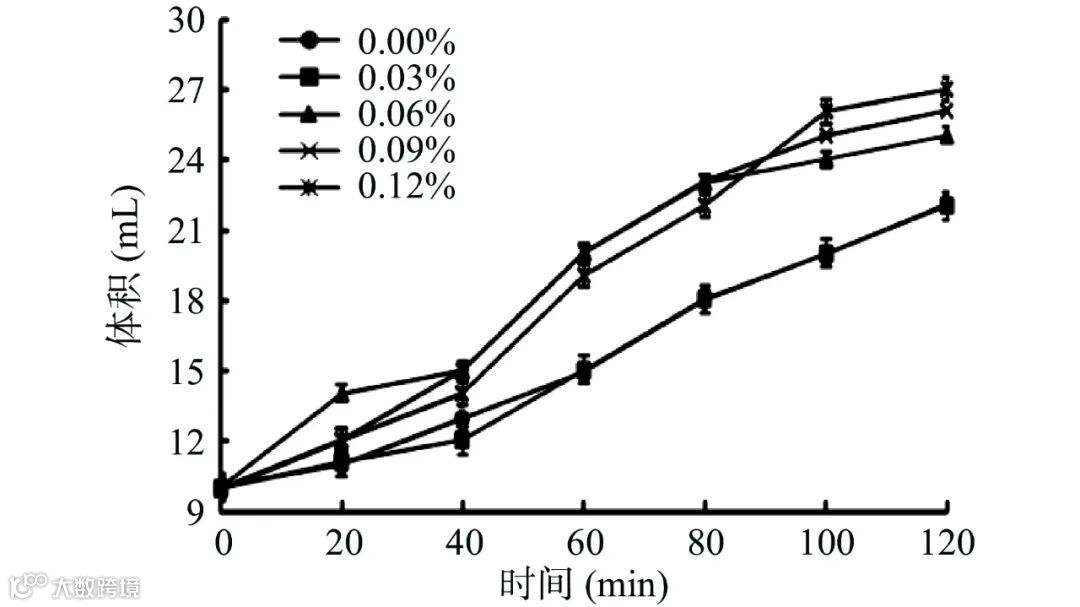 图 2 乳酸菌粉添加量对发酵面团体积的影响