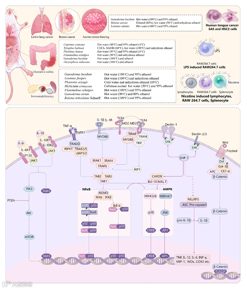 图2 食用菌多糖的免疫调节、抗炎和抗癌/肿瘤活性,涉及细胞和小鼠模型及相关机制