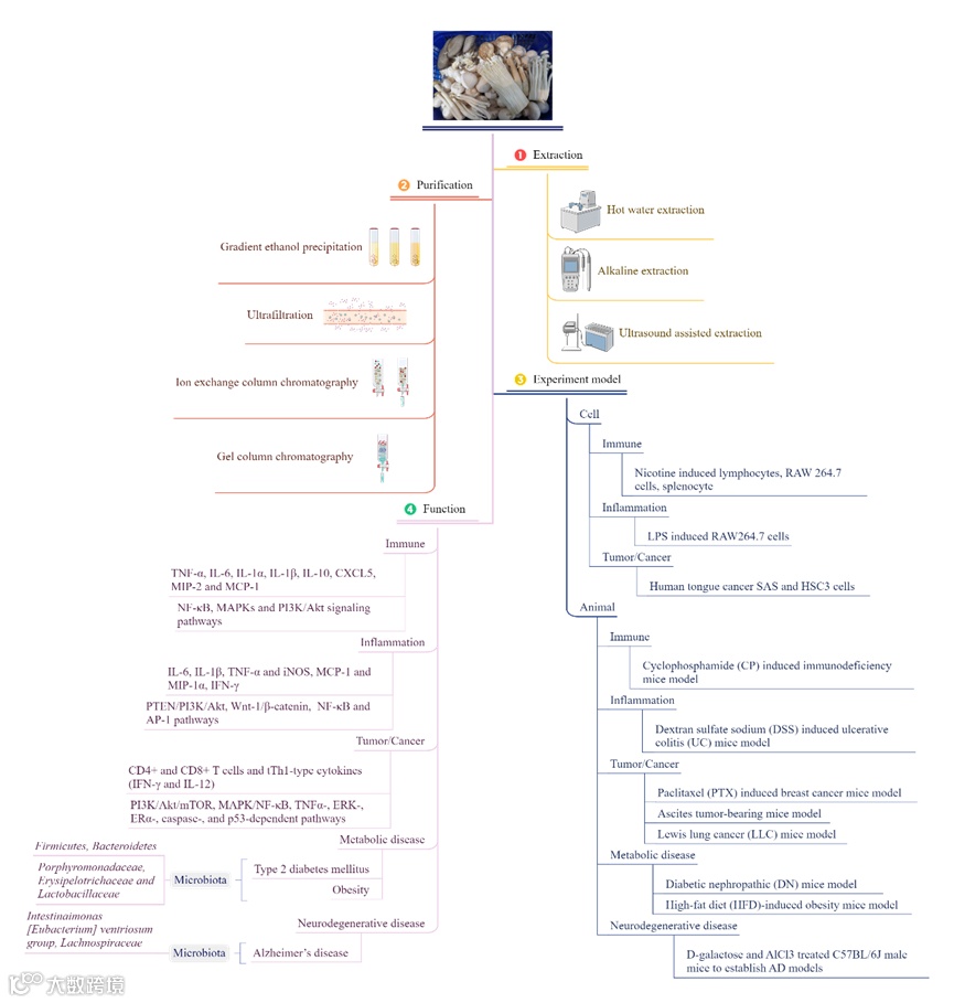 图1 食用菌多糖的提取方法、纯化方法、实验模型及功能活性研究