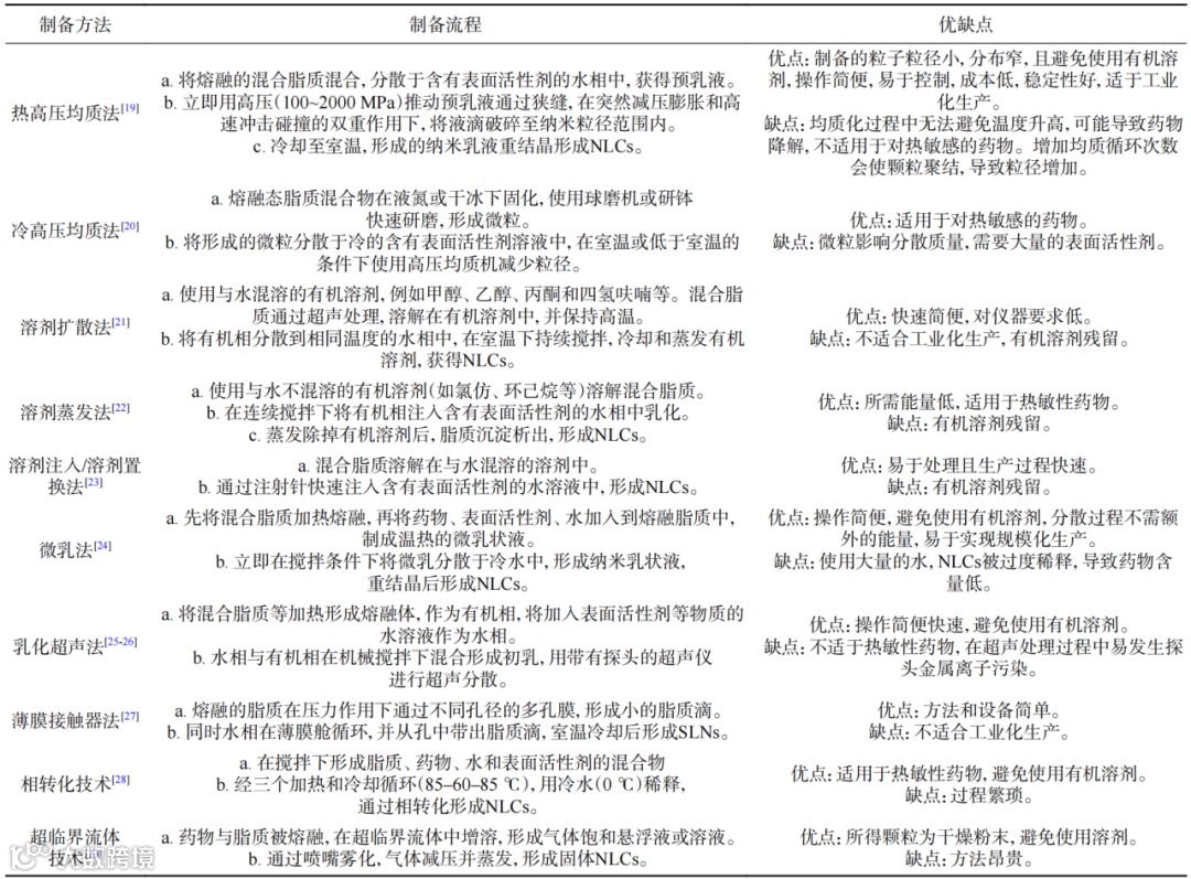 NLCs的制备方法与固体脂质纳米粒(Solid lipid nanoparticles,SLNs)相似,主要包括热或冷高压均质法、溶剂扩散法、溶剂蒸发法、溶剂注入/溶剂置换法、微乳法、乳化超声法、薄膜接触器法、相转化技术、超临界流体技术等。
