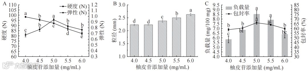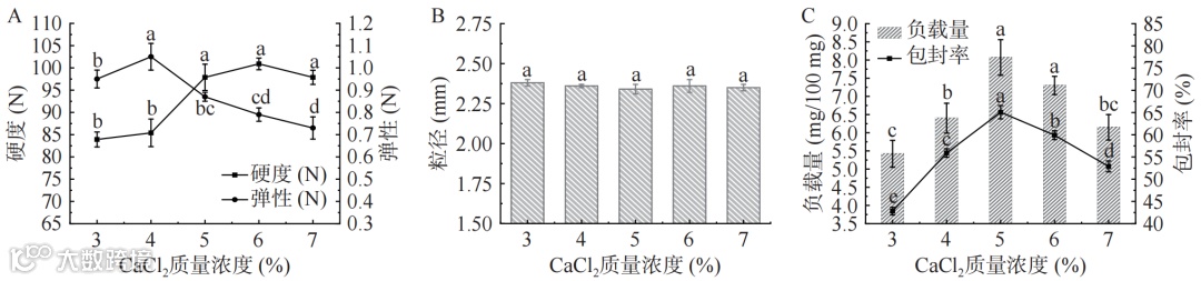由图4可知,随着 CaCl2 质量浓度的增加,凝胶球的硬度和弹性、包封率和负载量先增大后减小,凝胶球的粒径无明显变化。