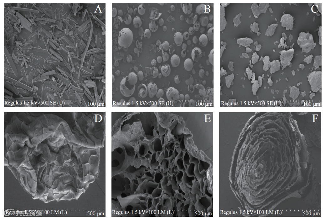 图6 NR(A)、HPCD(B)、NR-HPCD(C)、冻干复合多糖凝胶球表面(D)、空载凝胶球剖面(E)、载 NR-HPCD 凝胶球剖面(F)的 SEM 图