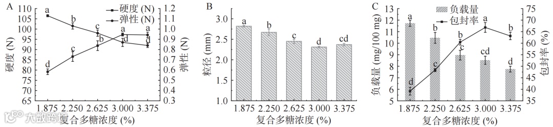 如图3所示,随着复合多糖浓度的增加,凝胶球的硬度先增大后保持稳定,弹性逐渐减小后趋于稳定,粒径先减小后增大,包封率先增大后减小,负载量持续下降。