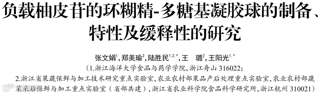 2023年4月,浙江海洋大学食品与药学学院、浙江省果蔬保鲜与加工技术研究重点实验室、农业农村部果品产后处理重点实验室、农业农村部蔬菜采后保鲜与加工重点实验室(省部共建)和浙江省农业科学院食品科学研究所陆胜民研究员及浙江海洋大学食品与药学学院王阳光教授课题组在国家综合性科技期刊《食品工业科技》发表题为《负载柚皮苷的环糊精-多糖基凝胶球的制备、特性及缓释性的研究》的论文。浙江海洋大学等陆胜民研究员和浙江海洋大学王阳光教授为通讯作者,浙江海洋大学张文娟硕士研究生为第一作者。论文得到了浙江省重点研发计划项目 (2021C02SA904696)的资助。