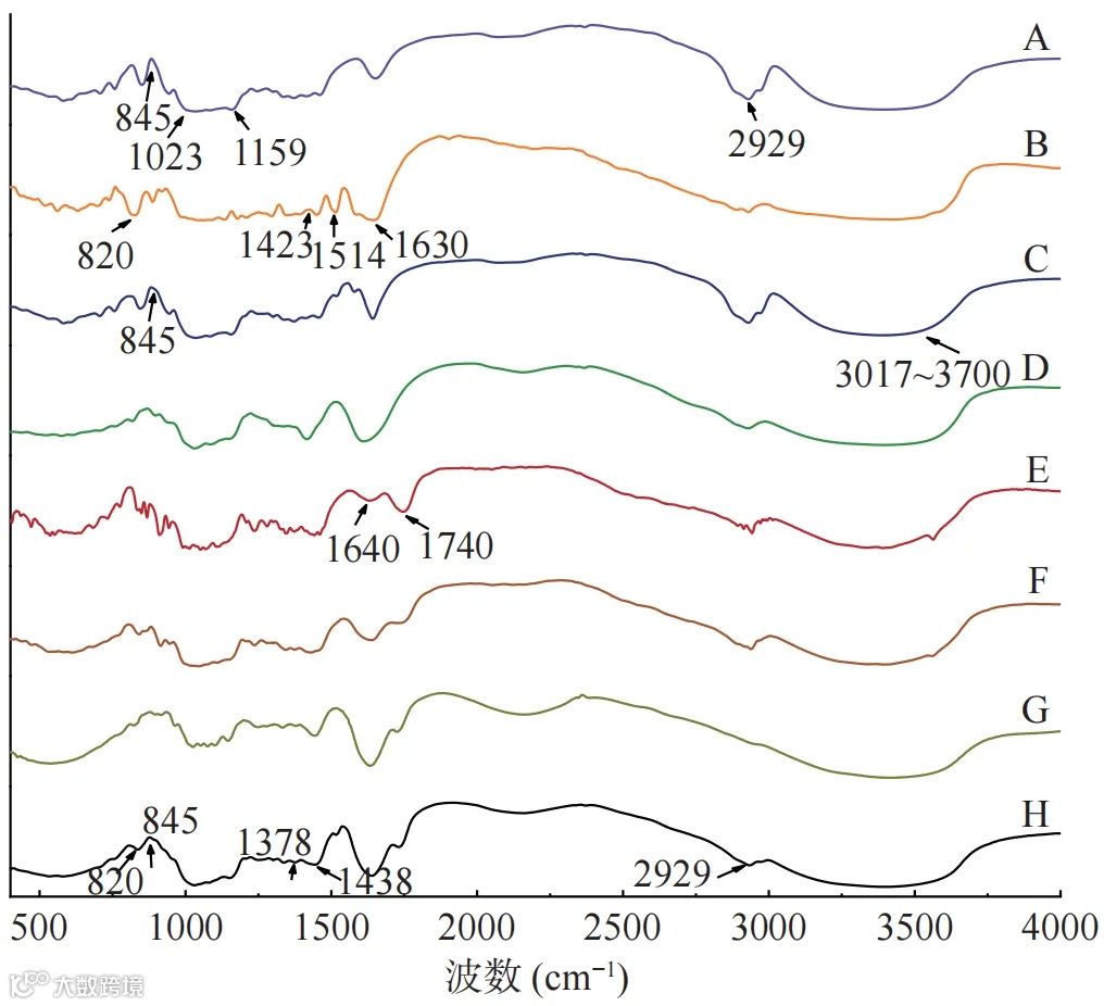 图7 HPCD(A)、NR(B)、NR-HPCD(C)、SA(D)、PEC(E)、物理混合物(F)、空白凝胶球(G)、复合多糖凝胶球(H)的FTIR 图谱