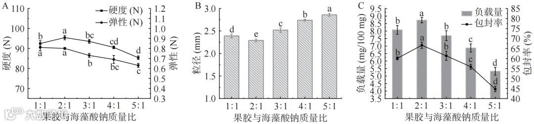 如图2所示,随着果胶与海藻酸钠质量比的增加,复合多糖凝胶球的硬度和弹性、载药能力均先增大后下降,而复合多糖凝胶球的粒径呈现先减小后增大的趋势。