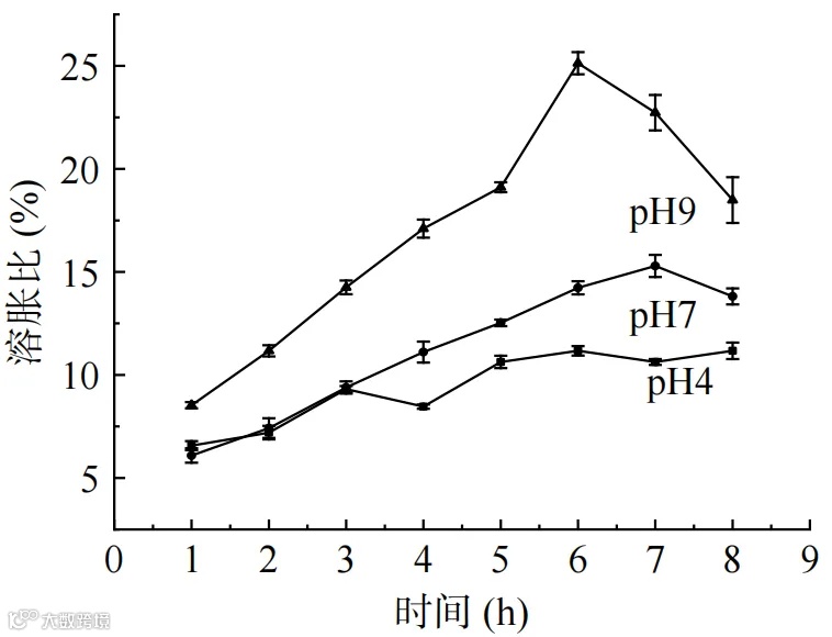 图8 凝胶球在不同 pH 介质中的溶胀曲线