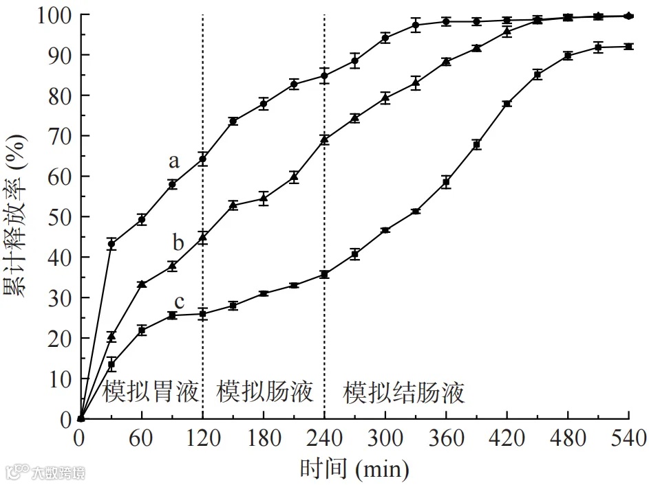 图9 NR-HPCD(a)、NR(b)和复合多糖凝胶球(c)在体外模拟消化中的累计释放曲线