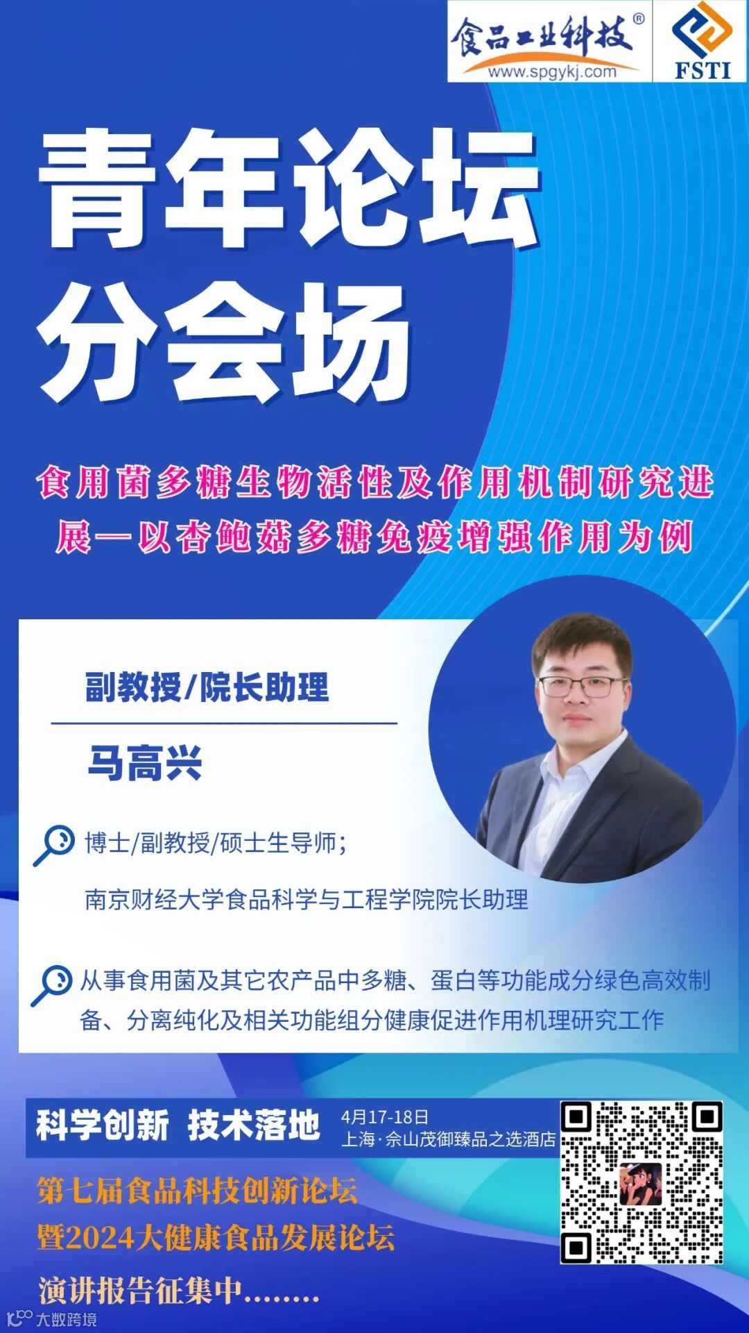 马高兴,博士/副教授/硕士生导师,南京财经大学食品科学与工程学院院长助理,主要研究方向为食品营养与功能,从事食用菌及其它农产品中多糖、蛋白等功能成分绿色高效制备、分离纯化及相关功能组分健康促进作用机理研究工作。主持国家十四五重点研发计划青年科学家项目,江苏省科技计划专项资金-现代农业青年科学家重点项目,国家自然科学基金青年及面上项目,江苏省农业自主创新资金等多项国家及省部级科研项目,参与国家自然科学基金面上项目、国家十三五重点研发计划子课题,江苏省成果转化基金等多项国家及省部级科研项目。发表学术论文数50余篇,相关成果获得2019年江苏省科学技术进步一等奖1项(7/11)。