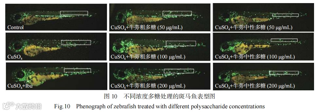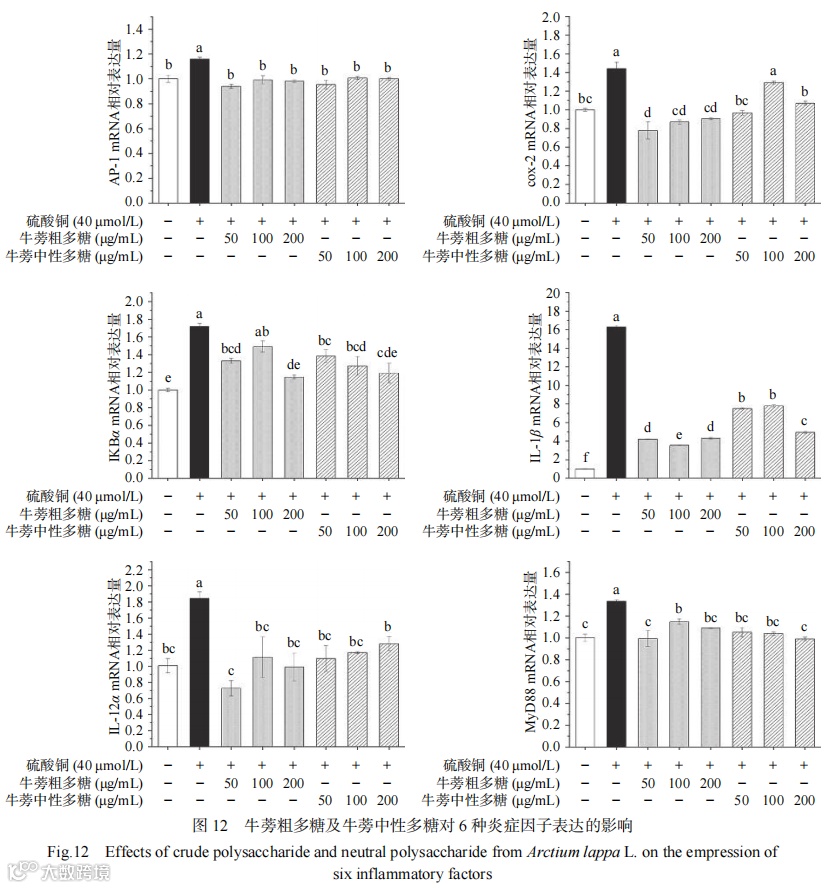 对水提醇沉法获得的牛蒡粗多糖进行分离纯化并对中性多糖组分进行结构表征和抗炎活性评价。通过DEAE-52纤维素柱制备牛蒡中性多糖,通过单糖组成、分子量、紫外、红外、XRD、粒径和核磁等方法对其进行结构表征,利用硫酸铜诱导的斑马鱼急性炎症模型,评价不同剂量牛蒡粗多糖和牛蒡中性多糖对斑马鱼巨噬细胞移动的影响。通过实时荧光定量PCR分析测定核转录因子激活蛋白-1(AP-1)、环氧化酶-2(COX-2)、IKBα、白细胞介素-1β(IL-1β)、白细胞介素-12(IL-12)和髓样分化因子(MyD88)等不同炎性因子mRNA的表达量。结果表明,牛蒡中性多糖重均分子量为2682 Da,数均分子量为2079 Da,主要由果糖和葡萄糖组成,摩尔比为11.32:1,粒径主要分布在80~110 nm。牛蒡中性多糖主要由β构型的呋喃糖组成,有明显的尖而窄的晶体衍射峰,结晶度较高,核磁结果显示其结构为α-D-吡喃葡萄糖基-(1→2)-[β-D-呋喃果糖基-(1→2)]10-β-D-呋喃果糖基。牛蒡中性多糖可以显著(P<0.05)减少斑马鱼巨噬细胞的迁移数目,且当浓度为100 µg/mL时,巨噬细胞数量较模型组下降了41.11%,抗炎效果最佳;牛蒡中性多糖可能通过沉默炎性细胞因子信号传导,抑制TLR4/MyD88/NF-κB信号通路的过度激活,从而抑制炎症反应。本研究可为牛蒡中性多糖的抗炎活性和开发功能性食品提供理论依据。