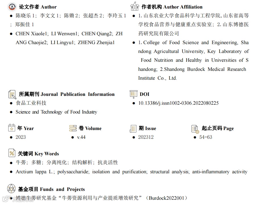 山东农业大学食品科学与工程学院郑振佳副教授、陈晓乐研究生等采用水提醇沉法提取牛蒡粗多糖,通过分离纯化制备牛蒡中性多糖并对其进行结构确定和抗炎活性评价,为牛蒡资源的开发提供依据。