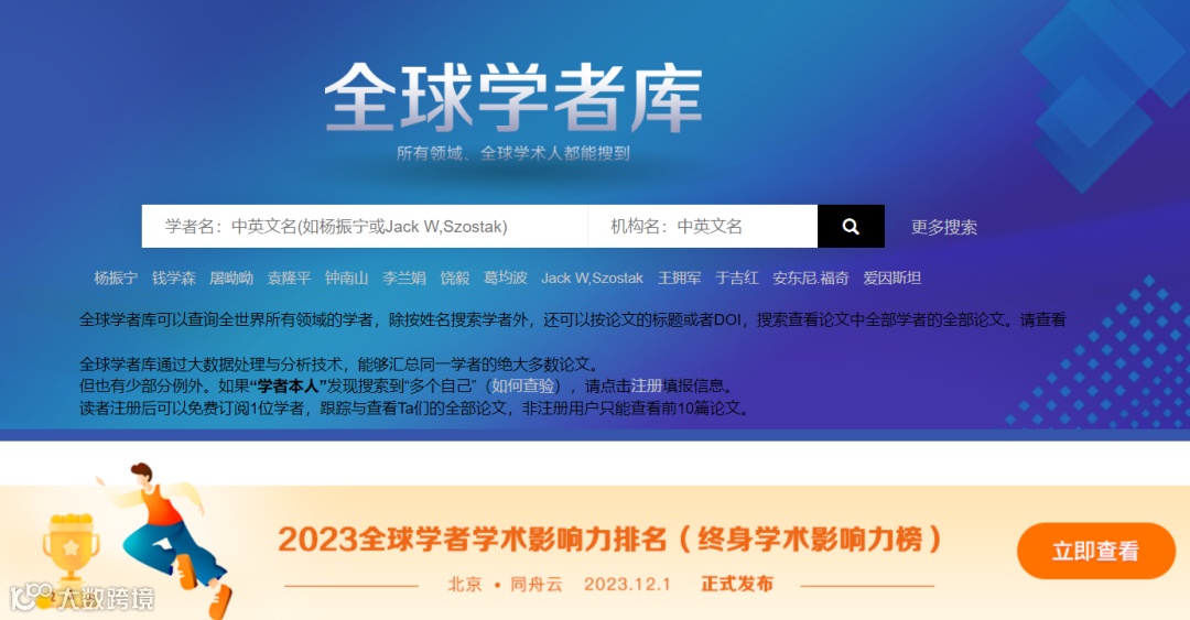 2023年12月,国内全球学者库(www.globalauthorid.com)发布了“2023全球学者学术影响力排名(终身学术影响力榜)”。该榜单是北京同舟云网络信息技术有限公司依托其研发的全球学者库®亿级海量文献数据以及强大的AI信息处理与数据挖掘技术,按照该公司独创的先进科技论文质量评估计分排名规则与方法对全球所有学科的学者近30年发表的文献进行集中处理和计算后得出的。