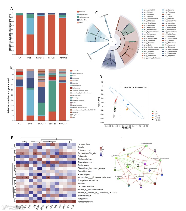 此外,它还改变了肠道微生物群的组成。这些发现表明富硒植物乳杆菌可能通过调节NF-κB-P65信号通路和调节肠道微生物群的结构来发挥其治疗作用。