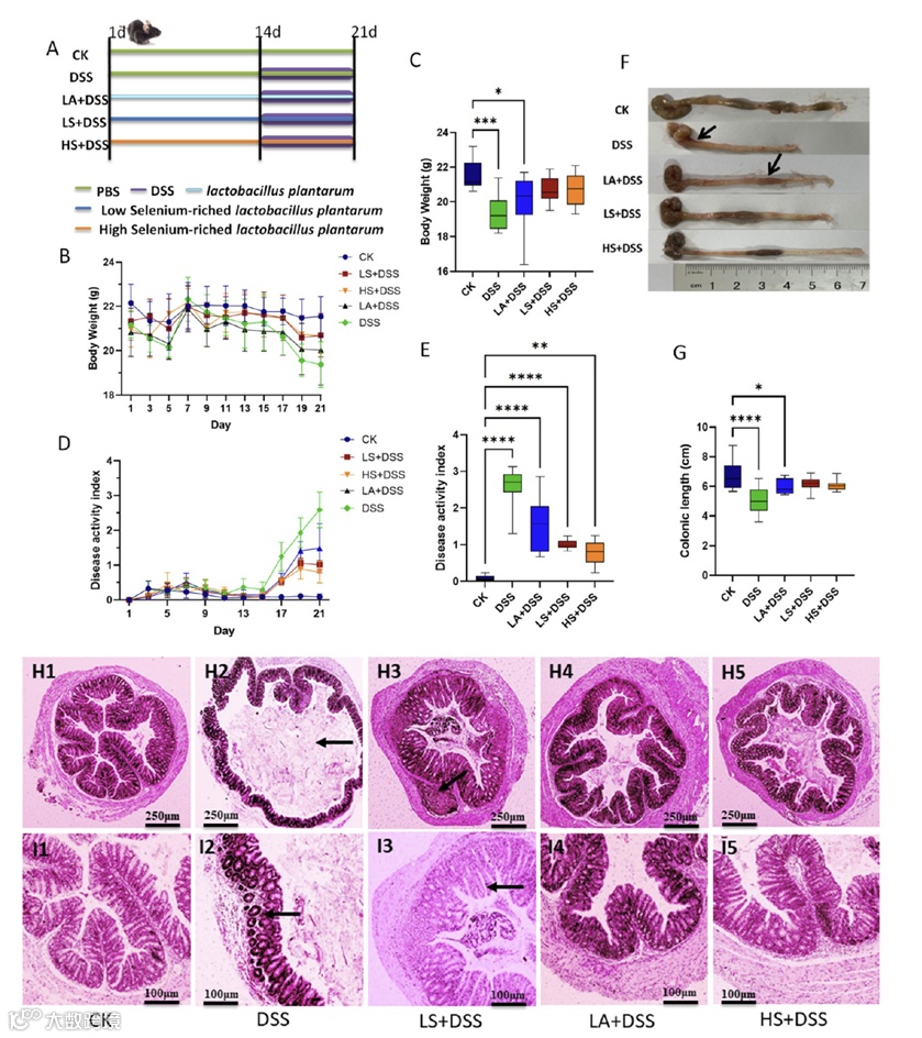 富硒植物乳杆菌对DSS诱导的结肠炎和肝脏炎症具有显著的缓解作用。它减少结肠组织中的氧化应激反应,并减轻结肠和肝脏炎症。