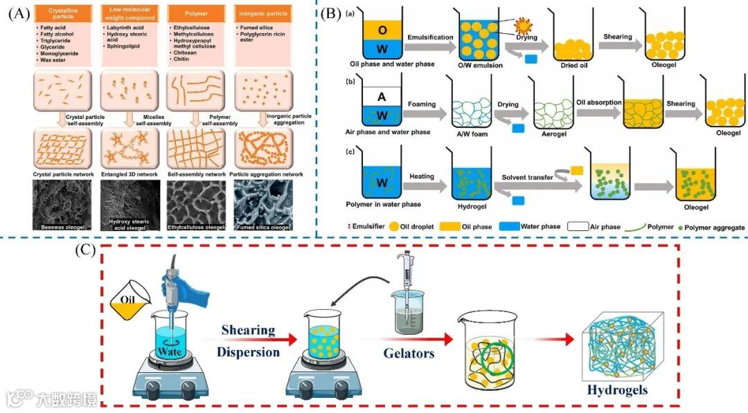 图3.(A)有机凝胶剂的分类和油凝胶的直接凝胶方法(Guo et al., 2023);(B)不同的油凝胶间接形成方法,乳液模板法(a)、泡沫模板法(b)和溶剂交换法(c)(Guo et al., 2023);(C)水凝胶的制备