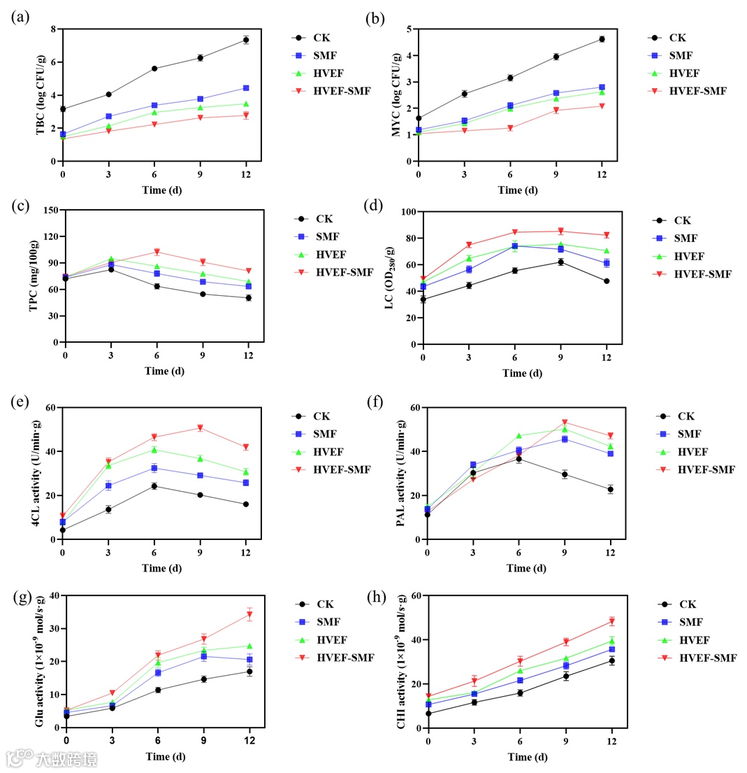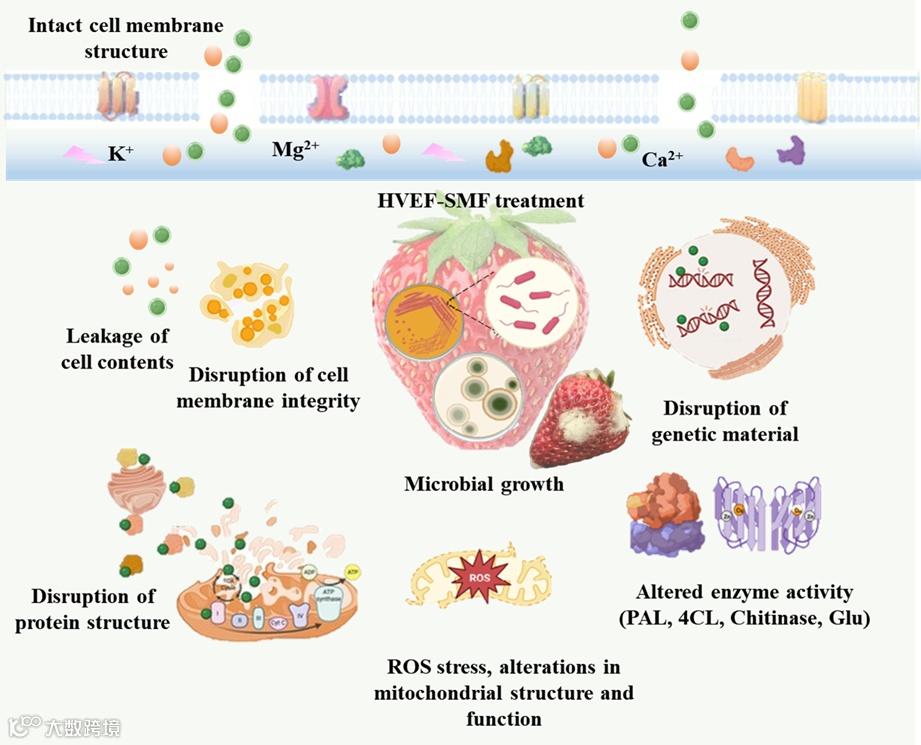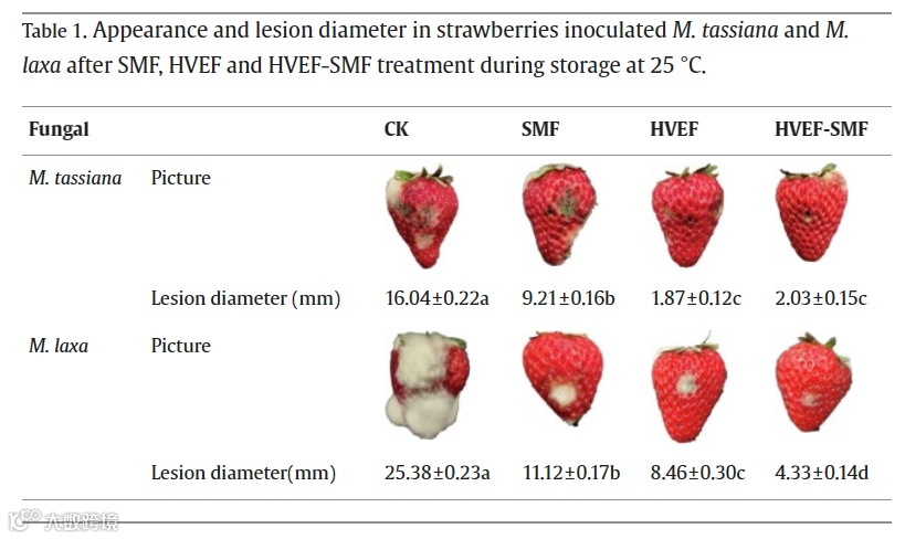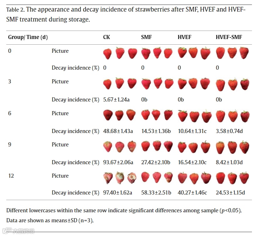 在本研究中,HVEF-SMF处理与单独的SMF和HVEF处理相比,对草莓霉变的抑制能力更强。