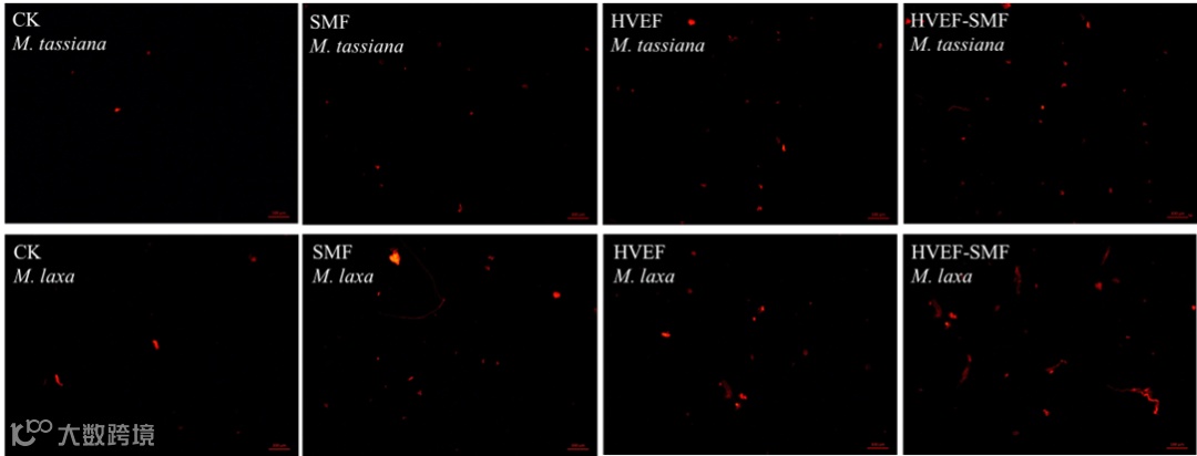 图4. 经PI染色的M. tassiana和M. laxa经SMF、HVEF和HVEF-SMF处理后的荧光图像