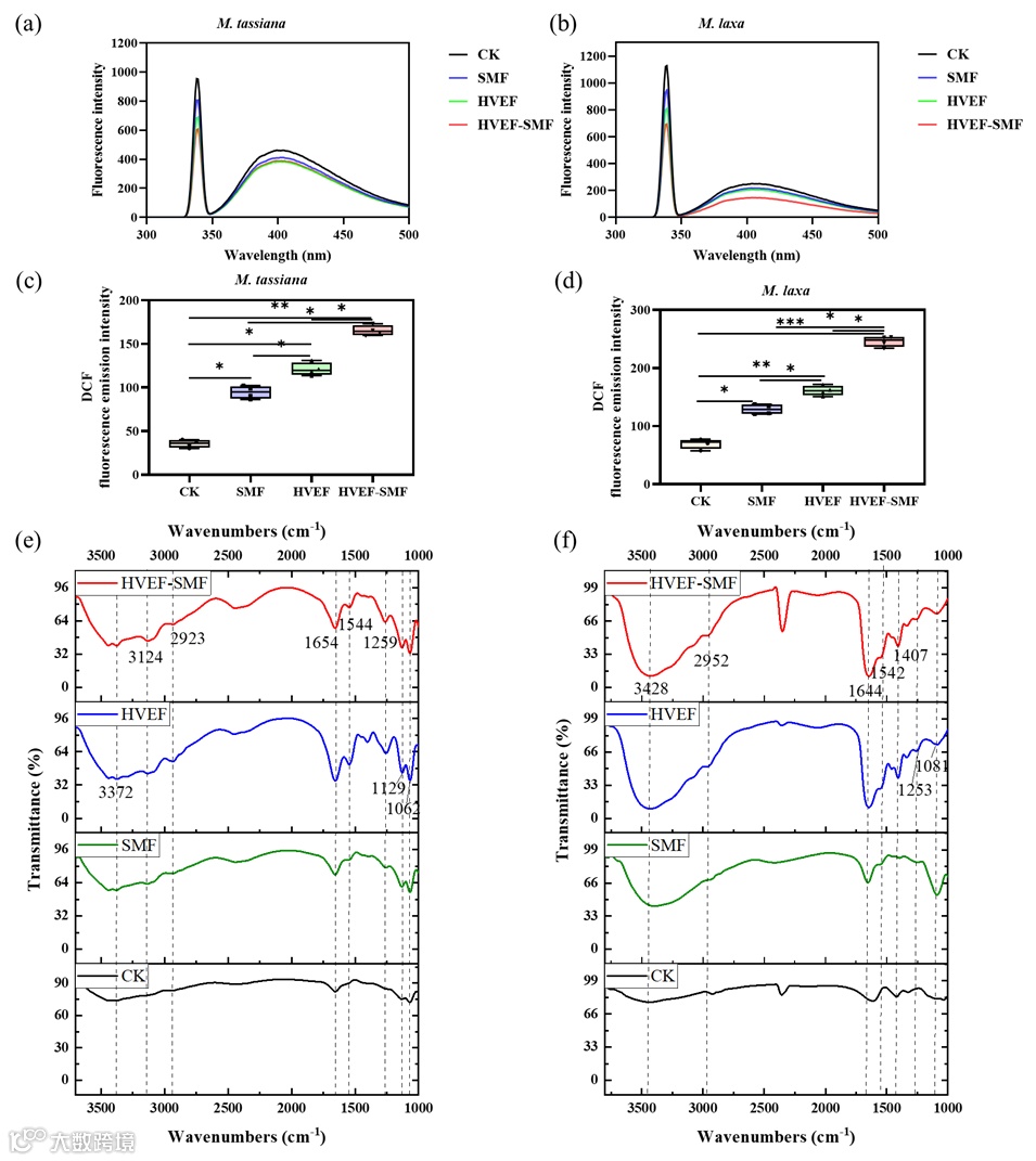 图3. SMF、HVEF和HVEF-SMF处理后M. tassiana和M. laxa的荧光强度变化、ROS生成和结构变化