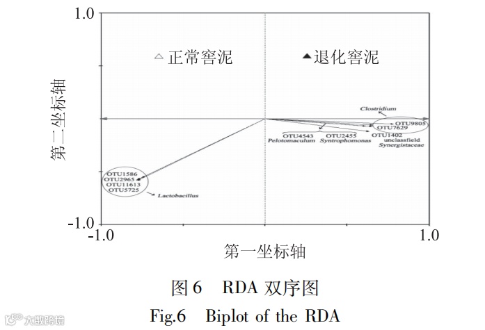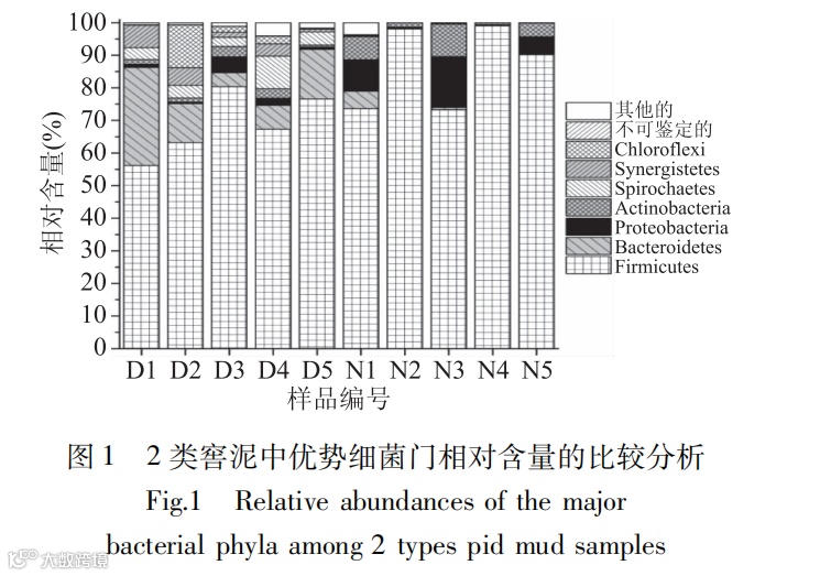 结果:采集了10个窖泥样品,包括5个正常窖泥样品与5个退化窖泥样品。退化窖泥呈银灰色,有白色针状晶体结块,无酯香味,而正常窖泥为灰褐(黑)色,有较强的酯香味。经过MiSeq高通量测序,共获得了279982个序列,根据97%的相似度,去除嵌合体后,共划分得到7606个OTU类型,平均每个窖泥样品1339个,并将它们鉴定为26个门,66个纲,108个目,233个科,524个属。α多样性分析表明,退化窖泥的Chao1指数和香农指数均高于正常窖泥(P<0.05)。多元统计分析表明,总体上来看,正常窖泥与退化窖泥的菌群结构具有显著差异(P<0.05)。正常窖泥和退化窖泥中均以厚壁菌门(Firmicutes)、变形菌门(Proteobacteria)、放线菌门(Actinobacteria)等为优势菌门(相对含量大于1%)。但是,正常窖泥中的螺旋体门(Spirochaetes)、互养菌门(Synergistetes)和绿弯菌门(Chloroflexi)的相对含量显著低于退化窖泥(P<0.05)。正常窖泥和退化窖泥共有的优势属有:乳杆菌属(Lactobacillus)、梭菌属(Clostridium)等。统计分析表明,正常窖泥中的乳杆菌、芽孢杆菌和雷尔氏菌显著高于退化窖泥(P<0.05)。