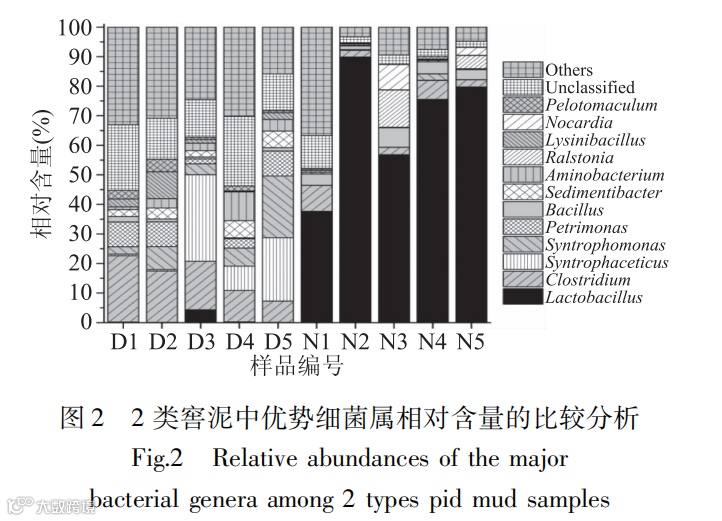 结论:正常窖泥不仅在外观上与退化窖泥差异较大,在菌群结构上更是如此:退化窖泥的微生物丰富度与多样性更高。随着窖泥的退化,窖泥中的优势菌门增加了螺旋体门,互养菌门,绿弯菌门,且优势属从5个变为9个。另外,我们发现正常窖泥中的乳酸杆菌占绝对优势,其相对含量高达67.91%,分析其可能具有产生白酒特征风味物质乳酸乙酯,并能抑制一些杂菌的作用。本研究对正常窖泥与退化窖泥微生物多样性的分析,证实了细菌多样性可以较为客观的判定窖泥,对后续窖泥质量的优化和窖泥退化的防治具有参考价值。