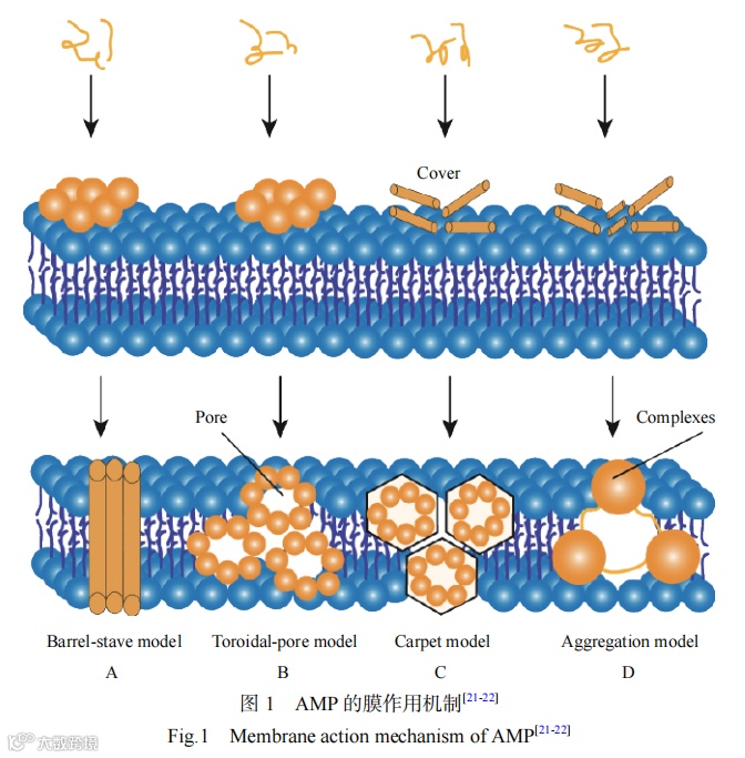 普遍认为AMP穿过细胞壁后,带正电荷的AMP与细胞膜通过静电引力发生作用,在细胞膜上形成穿膜孔,使细胞膜裂解,导致靶细胞死亡。当前膜作用机制有桶板模型、毯式模型、环膜孔模型,凝集模型、电穿孔模型、离子载体模型、无规则的环形模型等等膜作用方式。本文仅介绍以下比较常见的四种模型,相关机理如图1所示。