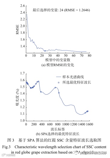 SPA算法提取过程见图3,根据RMSE的变化来确定被选取的特征变量,随着变量个数的增加,RMSE先迅速下降,表明光谱中的无用信息被高效剔除,然后趋于平稳。图4(a)中RMSE取得最小值24为选定的波长个数,最终选取的波长点索引见图3(b),模型取得最好的效果。