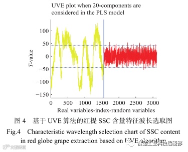 UVE提取特征波长的后选取的结果见图4,设定噪声矩阵最大稳定性绝对值的99%作为剔除阈值,左侧黄色曲线为光谱信息,右侧红色曲线为添加的噪声信息,只保留两条虚线外侧的有用信息。