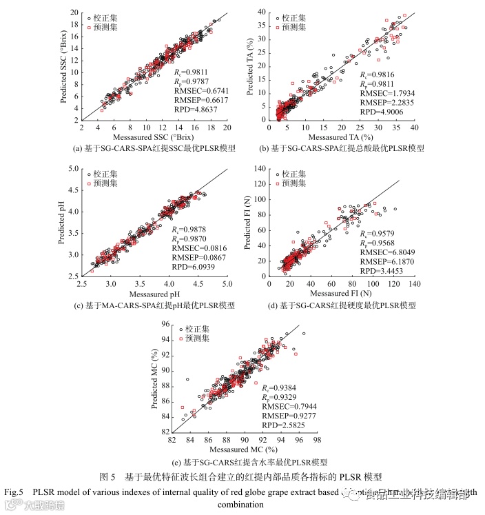 红提的SSC、TA的最优检测模型为SG-CARS-SPA-PLSR模型,pH的最优检测模型为MA-CARS-SPA-PLSR模型,FI和MC的最优检测模为SG-CARS-PLSR模型。