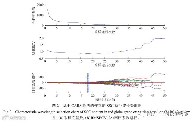 CARS的提取过程见图2,蒙特卡罗采样设置为50次,5折交叉验证。当RMSECV值达到最小值时,为所建PLSR模型的最优结果,当运行为图中竖线的位置时,RMSECV值最小值时,采样运行了18次。