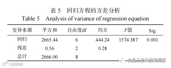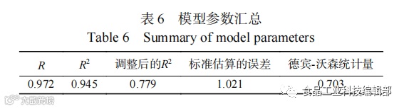 回归方程方差分析如表5所示,由表5可知,F检验统计量的概率Sig.=0.001(Sig.<0.05),说明自变量和因变量之间存在显著的线性关系,可以用线性模型来表示。如表6所示,回归方程的相关系数R和决定系数R2分别为0.972和0.945,表明本方程具有较高的拟合度,自变量能够解释因变量的大多数信息。德宾-沃森统计量(DW值)为0.703,DW值恰好处在显著水平为0.01的值域中。