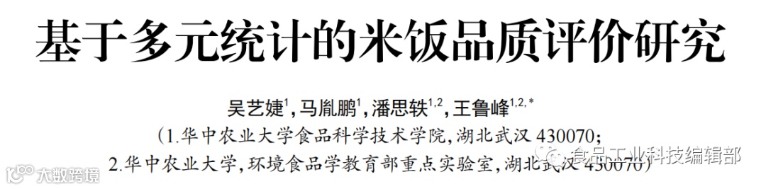 华中农业大学食品科学技术学院的吴艺婕、王鲁峰*等为了梳理感官评价和理化指标的关系,筛选关键性理化指标,建立简单易行的大米食用品质评价方法,以市面上的3种代表性大米为原料,分别采用3种不同的烹饪方法蒸煮得到9组米饭样品,利用多元统计分析研究米饭理化指标和感官指标之间的关系,筛选出能客观评价米饭食用品质的关键指标,再使用主成分分析初步建立米饭的品质评价方程。本研究对米饭品质评价体系的发展完善有积极作用,能较好地预测米饭的食用品质。