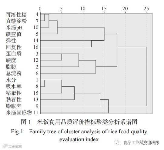 在有关研究中,王学锋从外观、质构两个方面选取12项指标对米饭的食味评价进行研究,其囊括了米饭外观的相关指标,使得模型更能贴近感官评价的各个方面,能更好地预测米饭的综合食味。基于此,本研究进一步对指标进行了聚类分析。