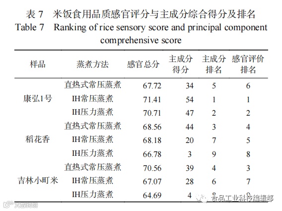 另外本研究通过对比各样品的感官评价得分、综合得分公式计算的主成分综合得分及排名,来验证基于主成分分析建立的米饭食用品质评价体系的可行性,结果如表7所示。结果显示,各样品的主成分综合得分排名与感官评分排名基本一致,基于主成分分析物性指标评价三种优质大米的米饭食用品质具有一定的可行性。康弘1号在IH常压蒸煮下的主成分排名和感官评价排名最高,稻花香、吉林小町米在直热式常压蒸煮下的主成分排名和感官评价排名较高。因此,康弘1号的最佳蒸煮方法为IH常压蒸煮,稻花香、吉林小町米最佳蒸煮方法为直热式常压蒸煮。结果也间接说明稻花香、小町米等东北粳米不适合压力蒸煮。